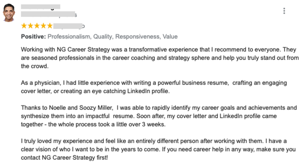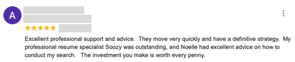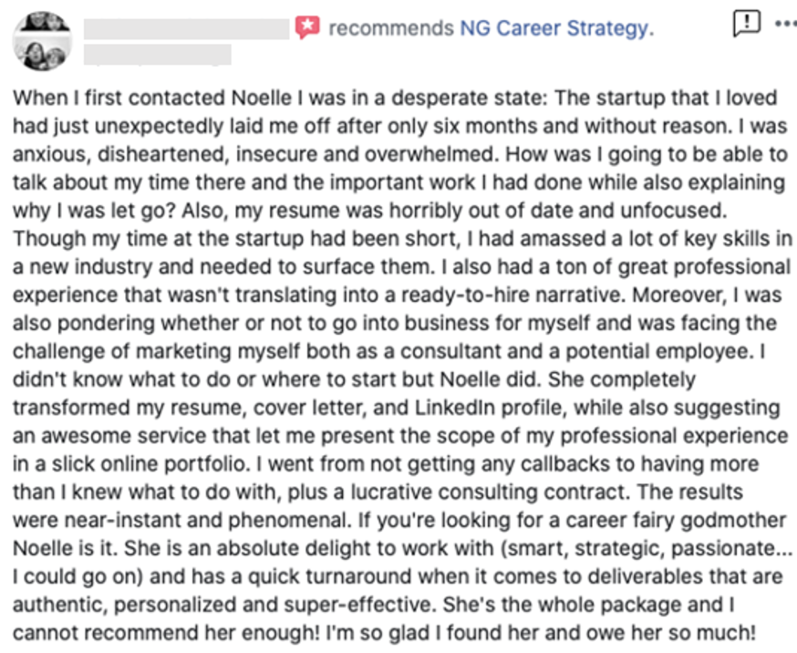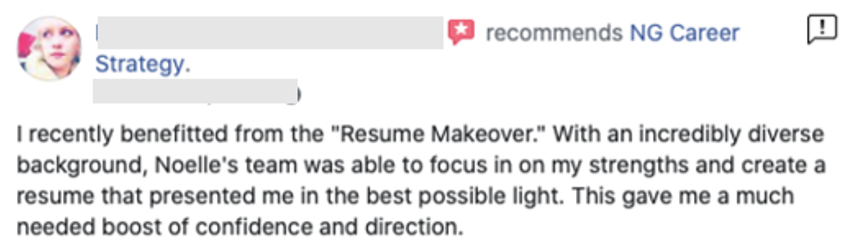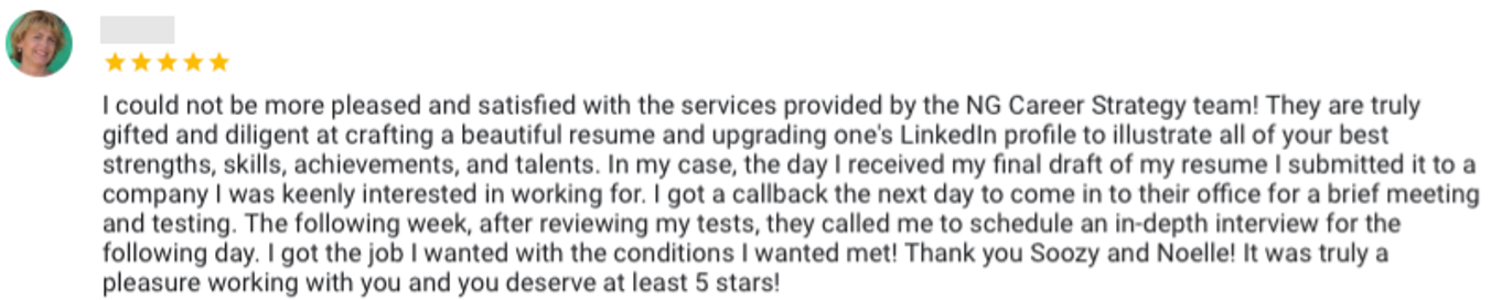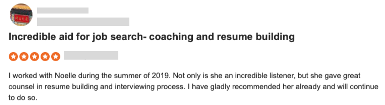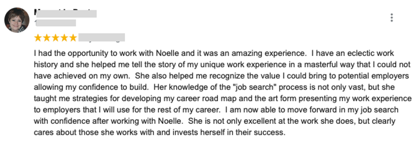"Noelle’s approach and guidance set me on a career path I would have never dreamt possible, while also giving me the skills to better my resume and career search down the road. Worth every penny!"