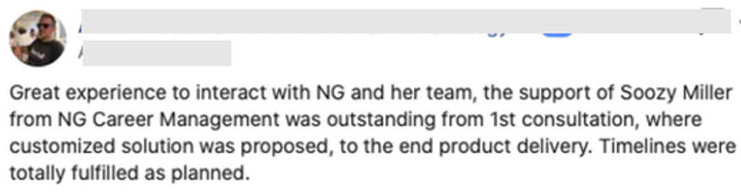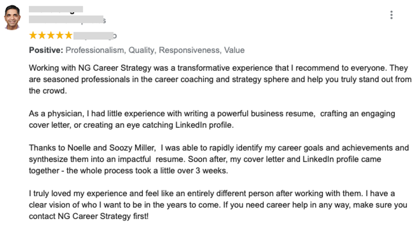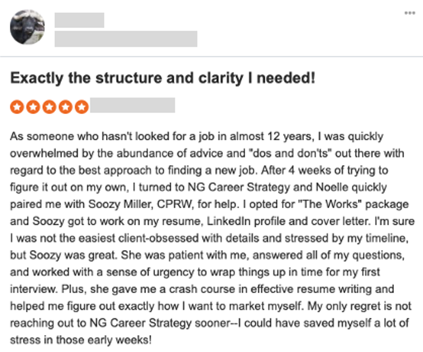 “I worked with Noelle in preparation for a full-scale job hunt – I had been “out of the game” for 4 years and needed a refresher, as I applied to a target position at a Fortune 50 company. Noelle was diligent, understanding and has a level of insight that is unmatched by anybody I have worked with in her industry."