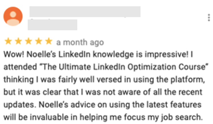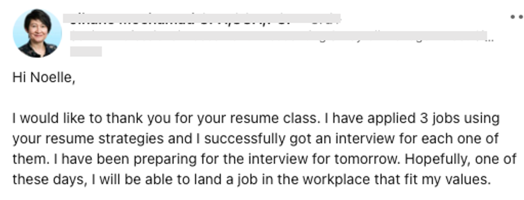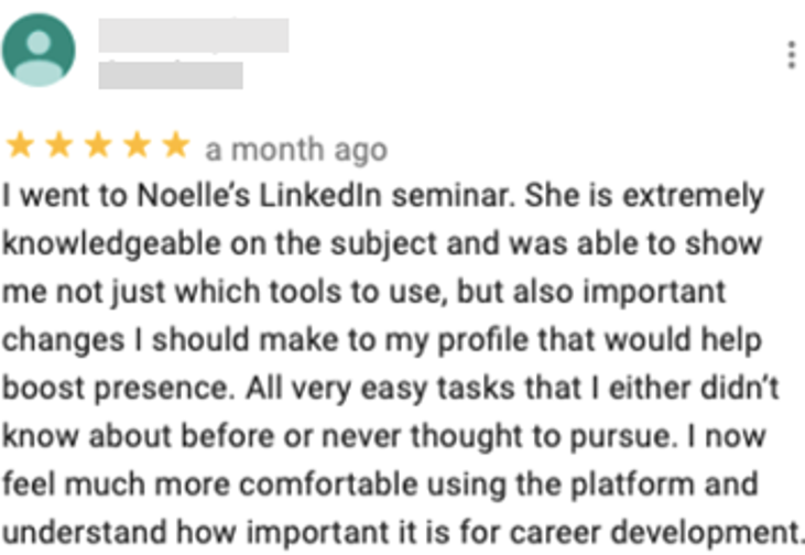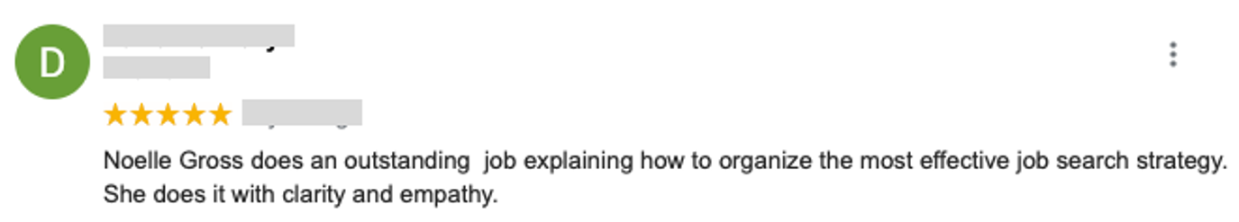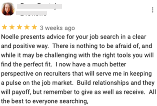 "Hi Noelle, I had to listen when my son told your group he got the job he wanted. :-) He has another interview next week as a result of an informational interview he held as a result of your bootcamp. He said you were immensly helpful with advice on his branding and resume. Your weekly zoom calls and homework break the work into parts that are easy to work on and discuss. Thank you for getting him on his first stepping stone to his career. So glad I found you when I did. I knew you would be a big help!"