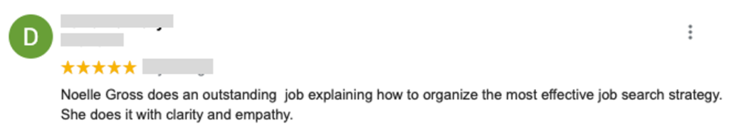 "Pause your job board scrolling activity and get ready to have a transformative experience with Noelle Gross in her 9 week bootcamp program of intensive career strategy support. Ready for professional redirection but without a proper LinkedIn profile, strategic plan, and outdated resume, I benefitted greatly from the course facilitated by Noelle. I am re-energized in my career transition pursuit with the complete professional branding package she has helped me to develop. The weekly topic of focus format provided information via the Job Search Accelerator website with webinars, lesson plans, templates and downloadable resources. Strategies for career development are presented in a succinct, manageable manner that I immediately implemented to optimize my career move, giving me greater knowledge and confidence in the process. I found the weekly live coaching to the topic of focus very engaging and supportive. It facilitated my accountability in completing coursework, kept the process moving forward, and provided an opportunity to benefit from individual coaching while enjoying nice small group support. Noelle is a knowledgeable, thoughtful, and detail oriented professional career coach. She is a pleasure to work with, is extremely responsive to email, and provided constructive feedback to questions and document development throughout the course. With my newly tailored cover letter, resume, and interview guidance support, I approached an interview feeling well prepared and confident with the professional brand she helped to facilitate. I highly recommend this program and working with Noelle Gross."